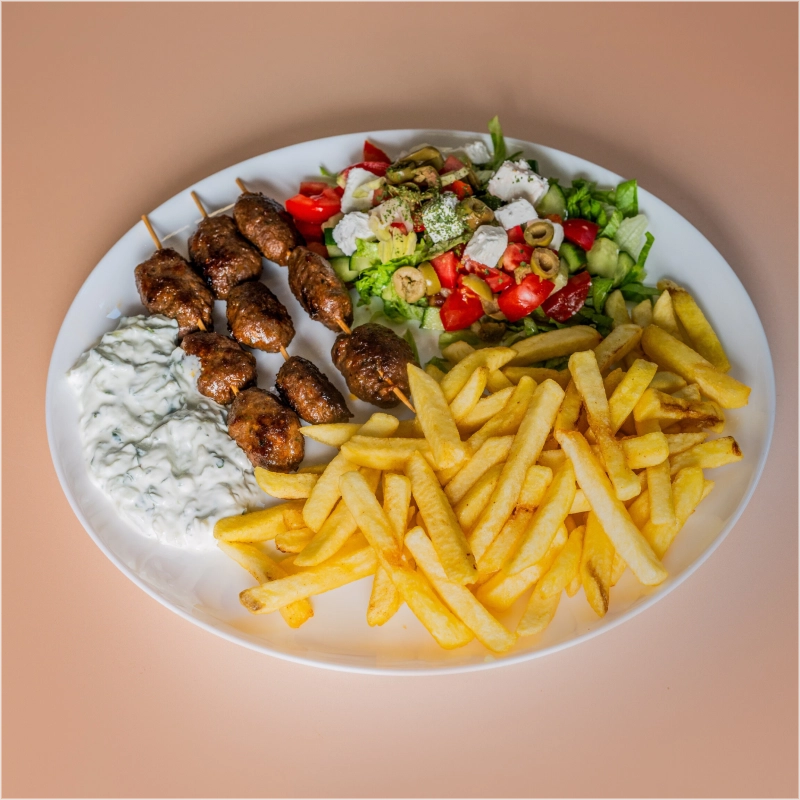 3 stokjes Kofte, friet, salade, mayonaise en een saus naar keuze.